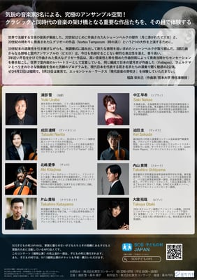 また、9/13(土)には世界で活躍する日本の若き演奏家8名による現代音楽のコンサートも企画されているそうです。このコンサートの売上金の一部も子どもの村に寄付されます。こちらもどうぞお楽しみに♫(会場:あいれふホール、18:30開演)